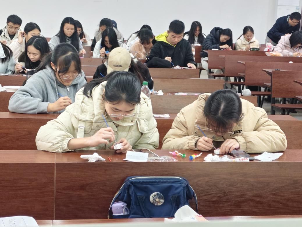 主讲人结合精美作品进行讲解,介绍石膏彩绘的基本步骤、配色技巧以及创作中的注意事项,帮助大家初步掌握创作方法,激发创作灵感。通过主讲人的讲解,同学们了解到石膏彩绘的最关键步骤是上色填涂,其核心是选择合适的颜料,先浅后深、干透叠色。在干事的指导下,同学们交流想法,分享灵感,并选取石膏白胚,体验石膏彩绘的具体流程,完成自己的石膏作品。随后,干事协助同学们完成养护工作,并表示完成后的石膏彩绘需进行彻底晾干,刷透明保护层,以方便保存。