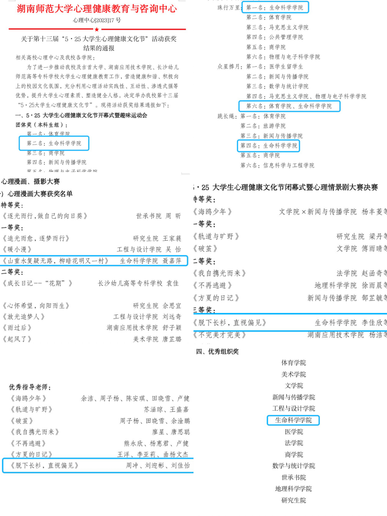 在心理漫画、摄影大赛中,2021级聂嘉萍作品《山重水复疑无路,柳暗花明又一村》获得校级一等奖;在心理情景剧大赛决赛中,2022级生科五班作品《脱下长衫,直视偏见》获得校级三等奖;学工办周冲、刘迎彬,校心理中心刘佳怡三位老师获优秀指导老师称号。