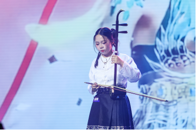 邱靖雯身着传统服饰,携手两位跨学院搭档对《崇拜》进行创新演绎。她以精湛的二胡演奏作为序曲,巧妙融合民乐韵味与现代流行元素,随后以清透悠扬的歌声诠释歌曲内涵,在舞台光影变幻间,打造出一场跨越时空的艺术对话。