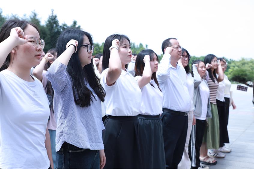 在院党委副书记彭赛丰的带领下,全体毕业生党员整齐列队,怀着崇敬之情向伟人铜像鞠躬致敬。面对鲜红党旗,由21级学生干部邱靖雯同学领誓,全体党员高举右拳,庄严宣誓,重温入党誓词,铿锵誓言回荡在广场上空,彰显青年党员不忘初心、牢记使命的坚定信念。