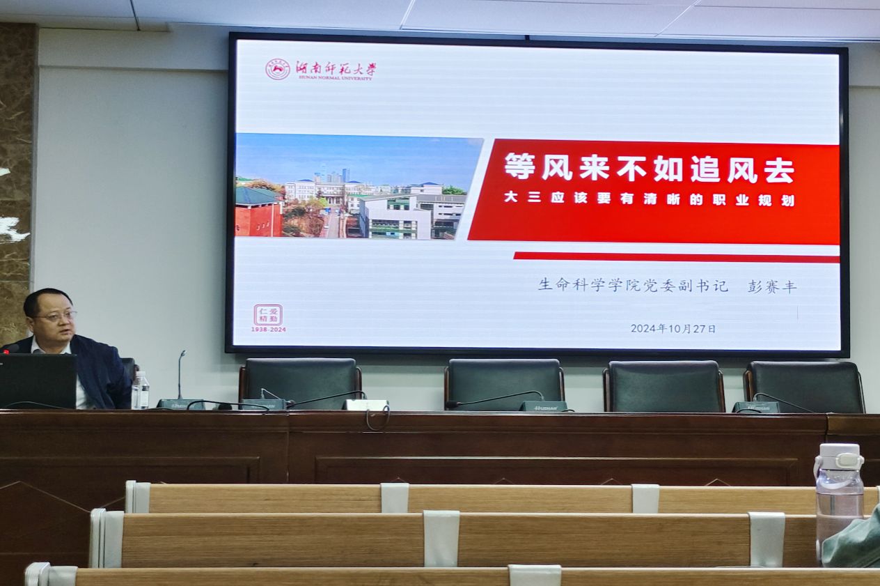 (通讯员 周佳琳 唐雨楠 邓芝涵)为帮助同学们清晰学年规划,提供就业指导,10月27日下午,生命科学学院于生科院三号楼B307学术报告厅举行讲座。生科院党委副书记彭赛丰担任此次讲座主讲人。学工办主任兼2022级辅导员周冲担任主持人。生科院2022级全体同学参加此次讲座。