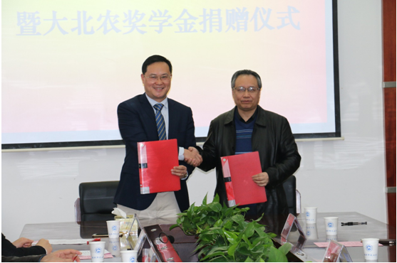 副校长欧阳峣代表学校和大北农水产科技集团总裁易敢峰签订了科技合作协议和奖助学金捐赠协议。